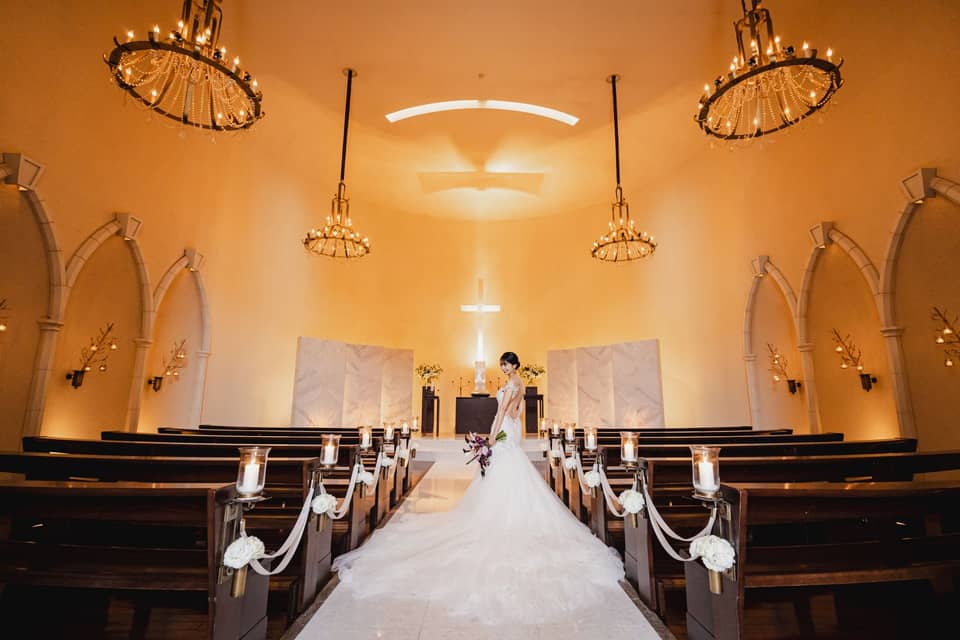 大理石でできた輝くバージンロードに映るおふたりのシルエットや、5mの大きな扉から差し込む光を生かしたお写真をお撮りいただけます。